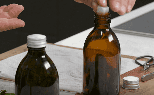 Заложить все листья в бутылку объемом 300 мл. Лучше всего подойдет бутылка из темного стекла — через нее проникает меньше солнечных лучей.