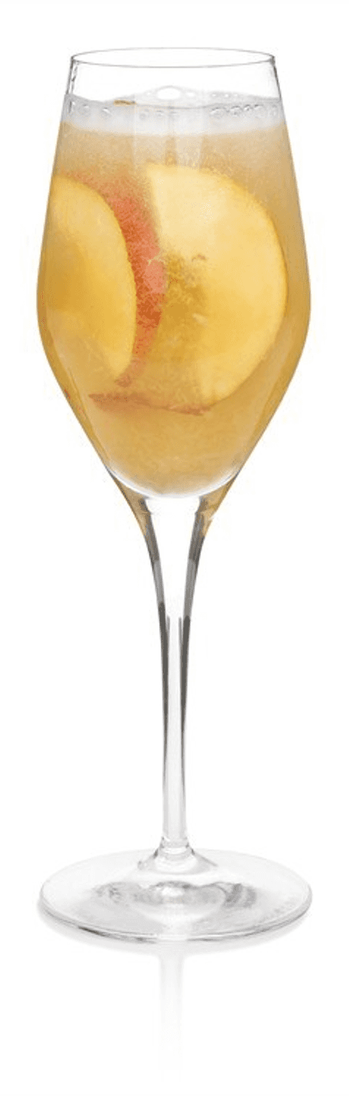 Перелить в охлажденный бокал для вина и залить игристым, перемешать. Можно украсить долькой свежего персика.