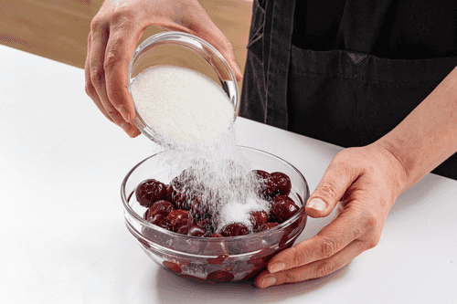 Вишню засыпать сахаром и оставить на 1 час, чтобы она дала сок.
