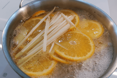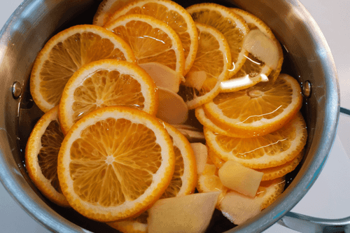 Выложить апельсин и имбирь в кастрюлю, налить воду. Поставить на сильный огонь.