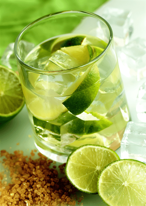 С лаймов срежьте цедру и порежьте на длинные полоски, переложите в миску и добавьте сок лайма, 8 тонких полосок имбиря, сахар и 30 листьев мяты. Пестиком слегка разотрите смесь и переложите в большой кувшин. Залейте кешасой.