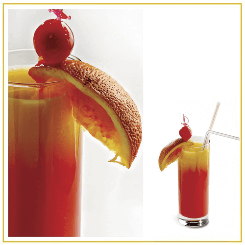 Коктейль «Текила-санрайз» — это яркий и эффектный напиток, воплощающий в себе красоту утренней зари. Его история начинается в 1970-х годах в Калифорнии, где он быстро завоевал популярность благодаря своему необычному внешнему виду и легкому, фруктовому вкусу. Глубокий красный гренадин, плавно переходящий в золотистый апельсиновый оттенок, создает завораживающий градиент, который напоминает восход солнца. На вкус коктейль сладкий, с освежающей цитрусовой ноткой и легкой терпкостью текилы, что делает его идеальным выбором для расслабленного вечера или летней вечеринки. Подается в высоком бокале, украшенный кружочком апельсина и коктейльной вишней, он не только радует вкусом, но и становится украшением любого стола.
