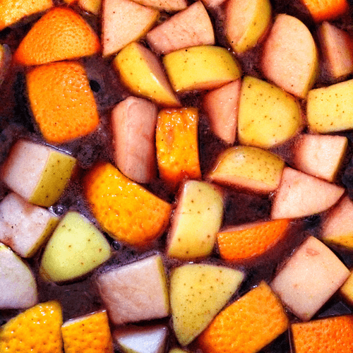 Смесь вина, сахара, нарезанных кубиками яблок, ломтиков апельсинов и пряностей довести до кипения.
