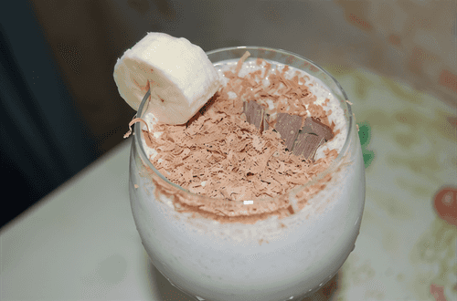 Украсить тертым шоколадом и бананом.