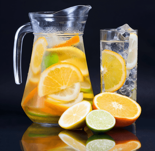 Процедите остывший сироп в графин и добавьте тертую цедру с 2 апельсинов, затем выжатый сок из 6 апельсинов и лимонов. Перемешайте и поставьте охлаждаться.