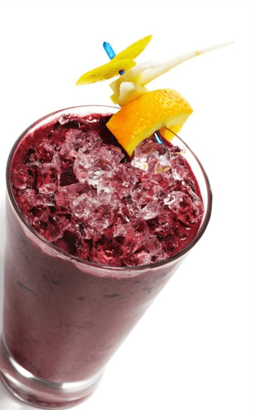 Наполнить стакан толченым пищевым льдом, влить смородиновый и лимонный соки и сахарный сироп.