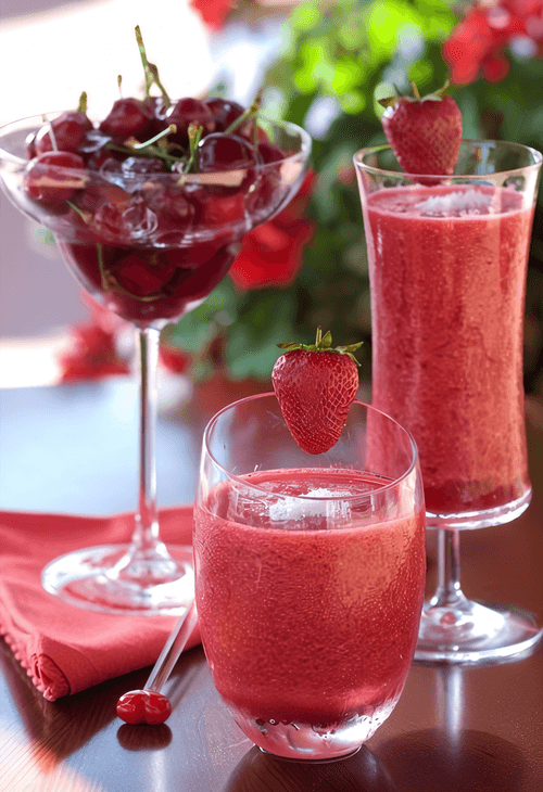 В блендере смешайте половину вишни, клубники и сока. Взбейте до состояния пюре и перелейте в бокалы.