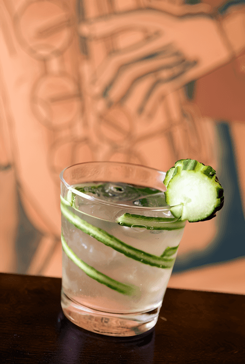 В высоком бокале толкушкой раздавите кусочки огурца, лайма и мяту до появления сока. Переложите в шейкер.