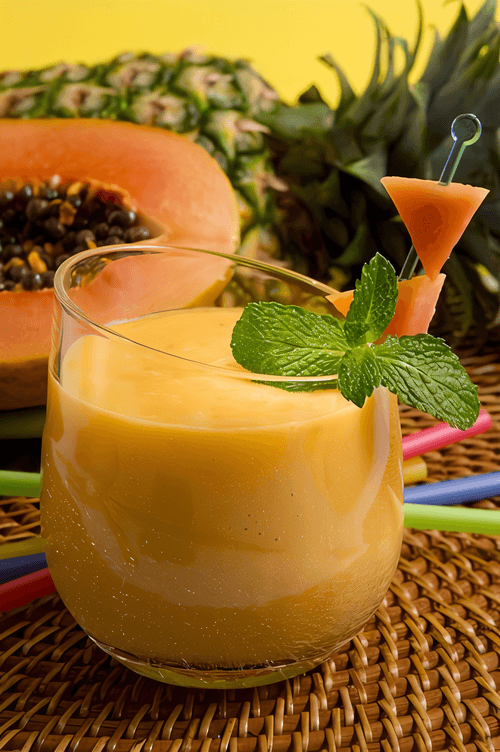 Смузи с папайей и персиками — это утонченный и освежающий напиток, который сочетает в себе яркость экзотической папайи и мягкую сладость спелых персиков. Этот рецепт черпает вдохновение из летних европейских традиций приготовления легких фруктовых напитков. Нежная текстура напитка достигается благодаря пахте, а добавление сока лайма придает смузи легкую кислинку, гармонично дополняющую его вкус. Кристальный лед превращает его в настоящий охлаждающий эликсир, идеальный для жаркого дня. Смузи не только утоляет жажду, но и насыщает организм витаминами и антиоксидантами, делая его прекрасным выбором для завтрака или освежающего перекуса. Подается сразу после приготовления, чтобы сохранить его свежесть и насыщенный вкус.