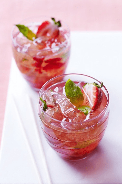 На дно стакана положить лед, нарезанную клубнику и мяту, оставшуюся клубнику разрезать пополам и красиво положить на дно стакана, прикрыть это все листочками мяты.