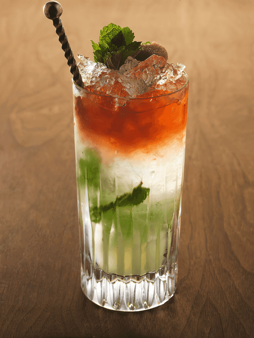 В бокал с колотым льдом положить половину мяты и влить слоями ром, сок лайма и сахарный сироп. Закончить ангостурой и горько-сладким биттером.