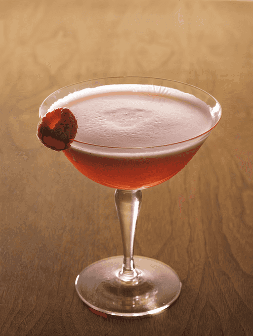 Процедить через стрейнер в охлажденный бокал. Украсить малиной.