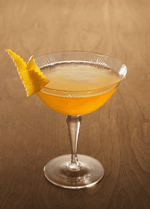 Перелить через стрейнер в охлажденный бокал. Украсить красиво вырезанной лимонной цедрой.