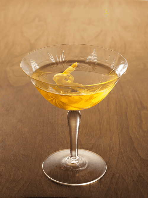 Перелить через стрейнер в охлажденный бокал. Украсить узелком лимонной цедры.