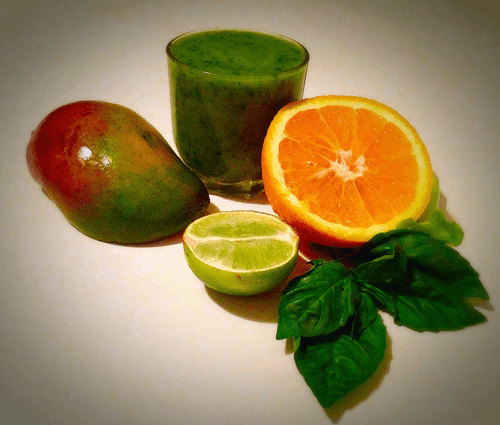Поместите в блендер манго, листья базилика вместе со стеблями, соки лайма и апельсина и листья шпината (если нет особой любви к шпинату можно, его опустить, но он дает смузи потрясающий зеленый цвет, который сразу говорит о приближающейся весне).
