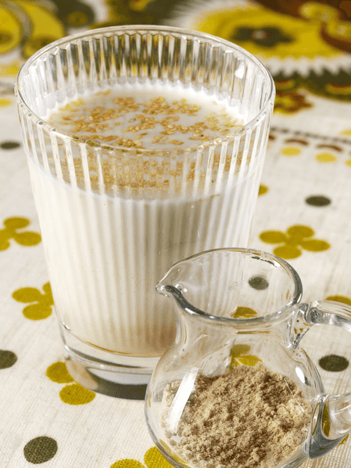 Добавить молоко обычное, посыпать сверху кунжутом.
