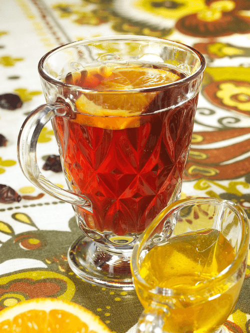 В чашку налить получившийся напиток, добавить мед, размешать и украсить долькой апельсина.