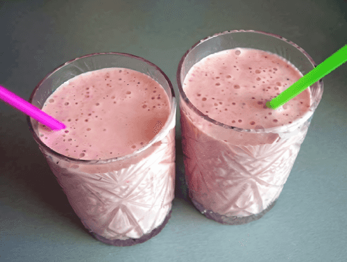 Замороженную клубнику и сахар добавить в банановое пюре и все вместе хорошо взбить (клубнику не размораживать, она будет служить естественным охладителем и заменителем льда и мороженного).