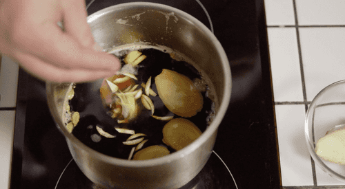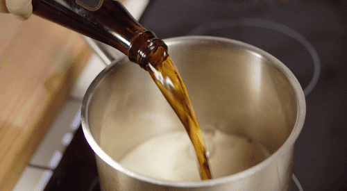 Залить в сотейник примерно полторы бутылки темного пива. Поставить на средний огонь. Как только появятся первые пузырьки, снять сотейник с огня. Главное — не доводить до кипения.