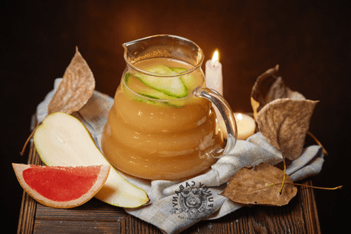 В чайник добавляют пюре груши, свежевыжатый грейпфрутовый сок, сироп корицы, три слайса огурца и небольшое количества лимонного сока.