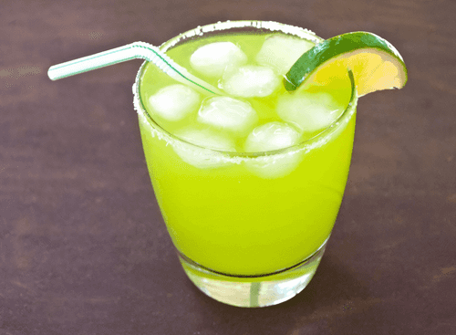 Дынный ликер смешать с ананасовым соком и добавить лед.