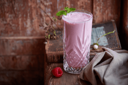 В витамикс (профессиональный блендер) налить молоко, мацони и пюре малины. Перемешать их в течение 0,5 минуты.