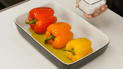 Красный, желтый и оранжевый перцы поместить в форму для запекания, смазать оливковым маслом, посолить, поперчить и отправить в духовку, разогретую до 180 градусов, на 20 минут.
