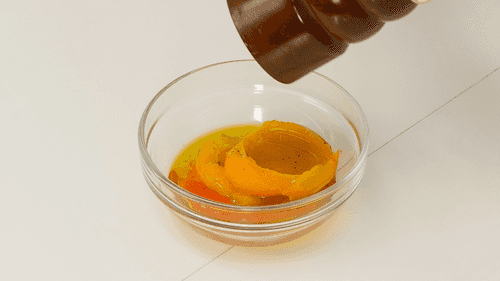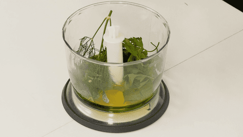 100 мл оливкового масла нагреть до 74 градусов и пробить в блендере вместе с укропом и петрушкой. Затем процедить через сито.