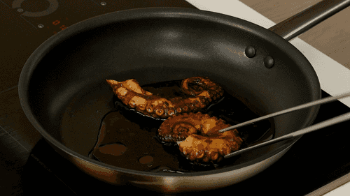 Разогреть на сковороде еще 15 мл оливкового масла, добавить терияки и соевый соус, положить осьминога. Обжаривать по 2 минуты с каждой стороны.