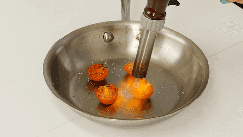 Помидоры, разрезанные пополам, выложить на огнеупорную поверхность, посыпать сахаром и солью, обжечь газовой горелкой.