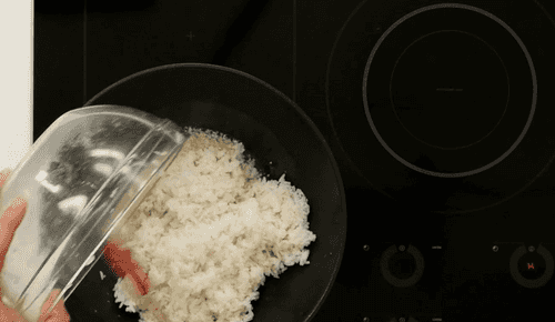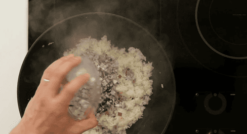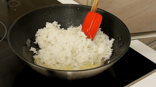 Добавить рис и жарить его, постоянно помешивая, в течение пары минут.