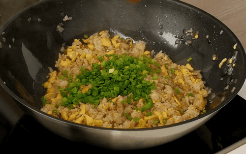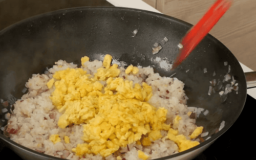 Затем добавить омлет, посолить и поперчить по вкусу и продолжить жарить и мешать. Нельзя чтобы рис пригорел ко дну вока.
