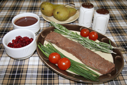 Корейку косули (200гр) маринуем в красном вине 90 мл с добавлением клюквы, розмарина,соли и специй по вкусу в течение 12ч.