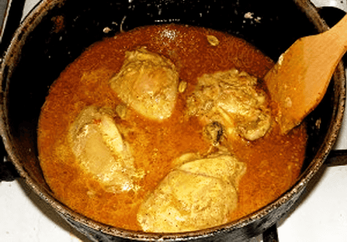 Курица готова тогда, когда будет видно в соусе, что масло отходит и образуются два слоя. Подают с отварным рисом.