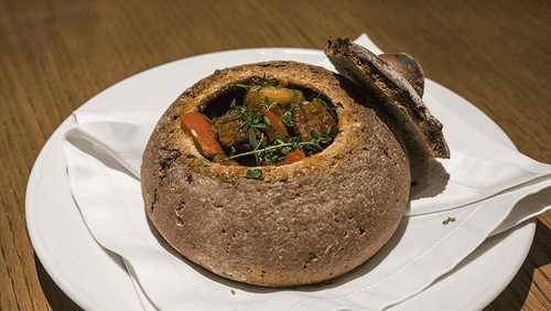 Национальный гастрономический символ Венгрии представляет собой нечто среднее между густым супом и мясным рагу. У гуляша множество местечковых интерпретаций, но есть единая прочная рецептурная основа — помимо мяса (свинины и говядины) важно добавить картофель, сладкий перец, а также помидоры. Иногда в гущу монументального супа-обеда внедряются еще и клецки-чипетки, но, если вы решитесь подать суп в хлебе, это будет уже перебор. В случае, когда в роли супницы задействована буханка, гуляш становится максимальным воплощением понятия one pot dish — хлебный мякиш отдает свой вкус супу, к тому же такой «кастрюлей» можно закусывать. Но и без хлебной посуды гуляш по этому рецепту получается таким, как надо, — очень мясным, очень пряным, чуточку острым и приятно насыщенным.