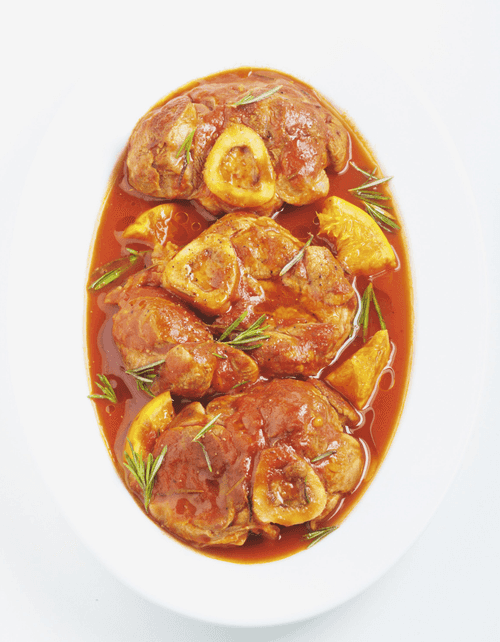 Разогрейте в кастрюле масло, подрумяньте оссобуко с обеих сторон, добавьте апельсиновый сок, цедру, розмарин и томаты конкассе.