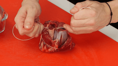 Обернуть мозговую кость марлей и перевязать, голяшки и остальное мясо плотно завязать кулинарной нитью, чтобы мясо не развалилось во время варки.
