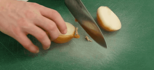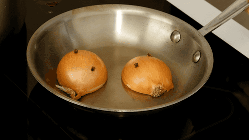 Воткнуть в половинки лука гвоздику, поджарить лук на сухой сковороде на стороне разреза до темно-коричневого цвета.