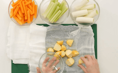 Поместить в марлевый мешочек отдельно каждый вид овощей.