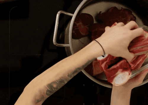 Поместить все говяжьи части на дно кастрюли, залить водой, довести до кипения, снять пену и снизить огонь.