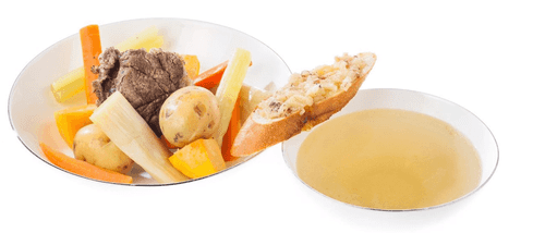 В большие тарелки выложить вареные овощи и кусочки мяса, а в небольшие глубокие тарелки разлить насыщенный мясной бульон.