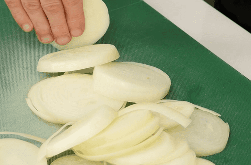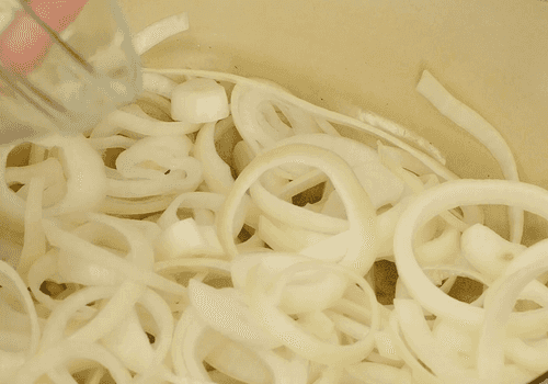 Нарезать лук кольцами.