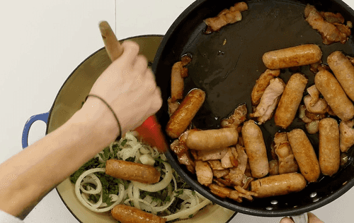Затем бекон и колбаски.
