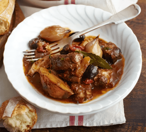 В сотейник положить мясо, помидоры, перец, оливки, перемешать, сверху поместить букет гарни и залить все вином, посолить и поперчить.