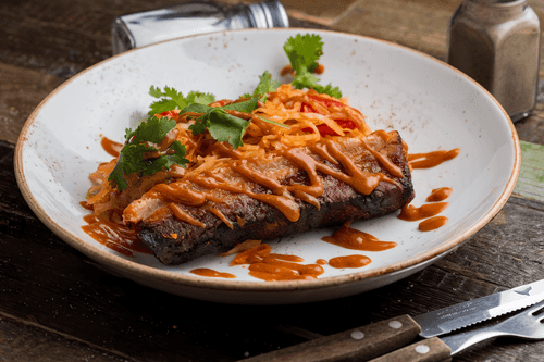 Подкопченная грудинка — это истинное воплощение русской кухни, объединяющее в себе глубину вкуса и ароматный характер традиционных методов приготовления. Этот рецепт уходит корнями в старинные способы сохранения мяса, когда копчение не только продлевало его срок хранения, но и обогащало вкус насыщенными древесными нотами. Грудинка, пропитанная специями и слегка подкопченная на ольховых опилках, приобретает неповторимый аромат, который гармонично сочетается с нежностью сочного мяса. Хрустящая капуста и сладковато-пряные помидоры черри добавляют свежести, а пикантный соус с карри и аджикой раскрывает блюдо новыми оттенками. Изысканным завершающим штрихом становится кинза, придающая легкую зелёную ноту. Подкопченная грудинка идеально подходит как для праздничного застолья, так и для уютного семейного ужина, вызывая восхищение своей простотой и богатством вкуса.