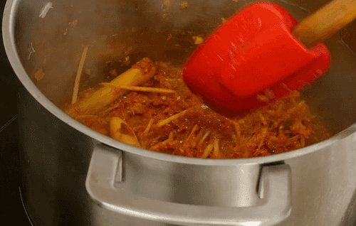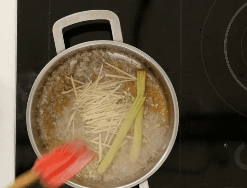 Добавить нарезанный соломкой галангал, отбитые стебли лимонной травы.