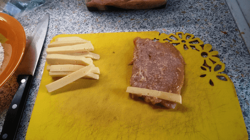 Взять подготовленное куриное филе и нарезать его тонкими пластинами, отбить.