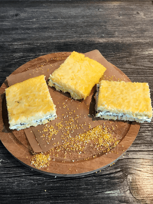 Остывшую поленту разрезать на прямоугольники.