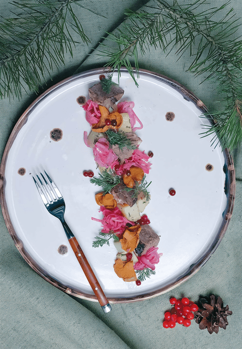 Коми-пермяцкий салат с солониной из лосятины, квашеной капустой, моченой брусникой и толченым картофелем