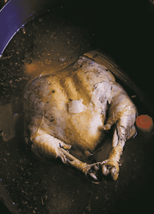 Рецепт взят из книги «Французская домашняя кухня. Сюжеты и рецепты виноградного края» Мими Ториссон. Названия некоторых блюд звучат куда лучше на французском! Ну разве можно сравнить пуль-о-по (poule au pot) с какой-то скучной вареной курицей? Помню, как впервые приготовила такую курицу для мужа, когда мы еще жили в Париже. «А ее разве не надо предварительно хотя бы обжарить?» — спросил он. Я наградила Оддура уничтожающим взглядом — таким, какой в переводе не нуждается. Позднее тем же днем, когда он с аппетитом уминал курицу, он тоже наградил меня взглядом, который говорил: «Ты была права, а я ошибался». Очень люблю, когда на меня так смотрят! Теперь Оддуру настолько нравится это блюдо, что он просил передать, что фотография этой курицы — его самый любимый снимок во всей книжке. Пуль-о-по — национальное достояние Франции, и у каждого региона есть своя версия этого блюда. Этот рецепт — результат долгих экспериментов. Но базой для него послужил замечательный рецепт мамы моей подруги Флоранс, которая придумала тщательно натирать курицу под кожей специальной чесночной смесью. И пусть вас не смущает скромный внешний вид этой курицы — она и впрямь потрясающая.